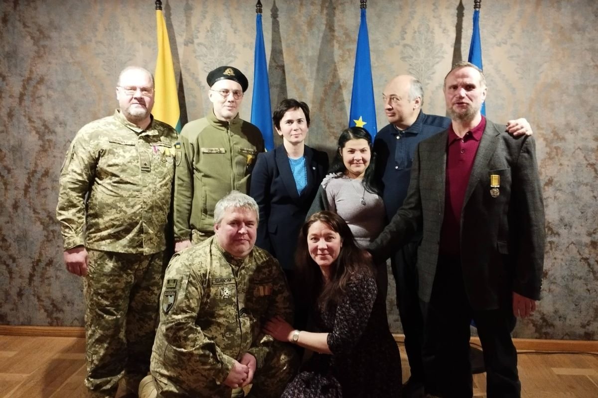 Stovi 1-as iš kairės LKKSS garbės narys Ukrainos ginkluotųjų pajėgų radiologijos tarnybos mjr. Oleksandr Snizko, 2-as LKKSS garbės narys 14-ojo atskirojo nepilotuojamų aviacinių sistemų pulko karys Evgen Nikolenko, 3-ia Lietuvos ambasadorė Ukrainoje Inga Stanytė-Toločkienė, 5-as LKKSS garbės narys Mykola Polischiuk, 6-as LKKSS garbės narys Rostyslav Mykheienko, priekyje priklaupęs Teritorinės gynybos seržantas Oleksii Kostiukevych.