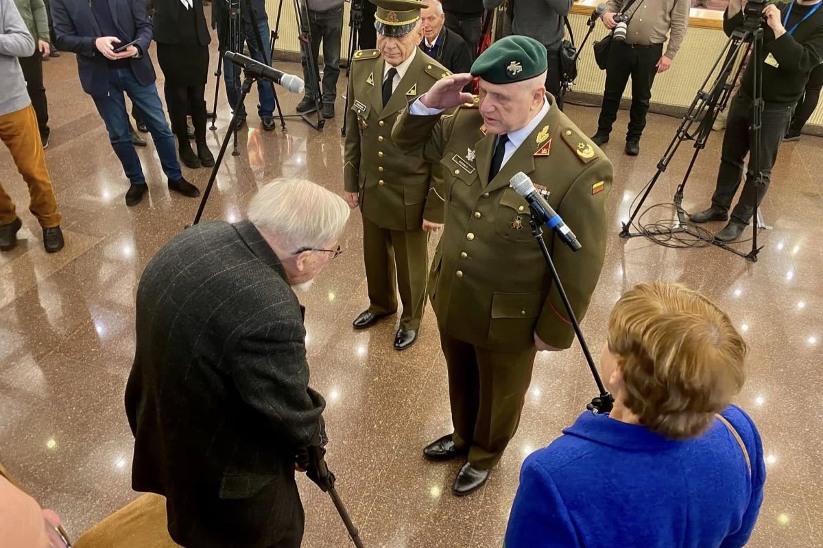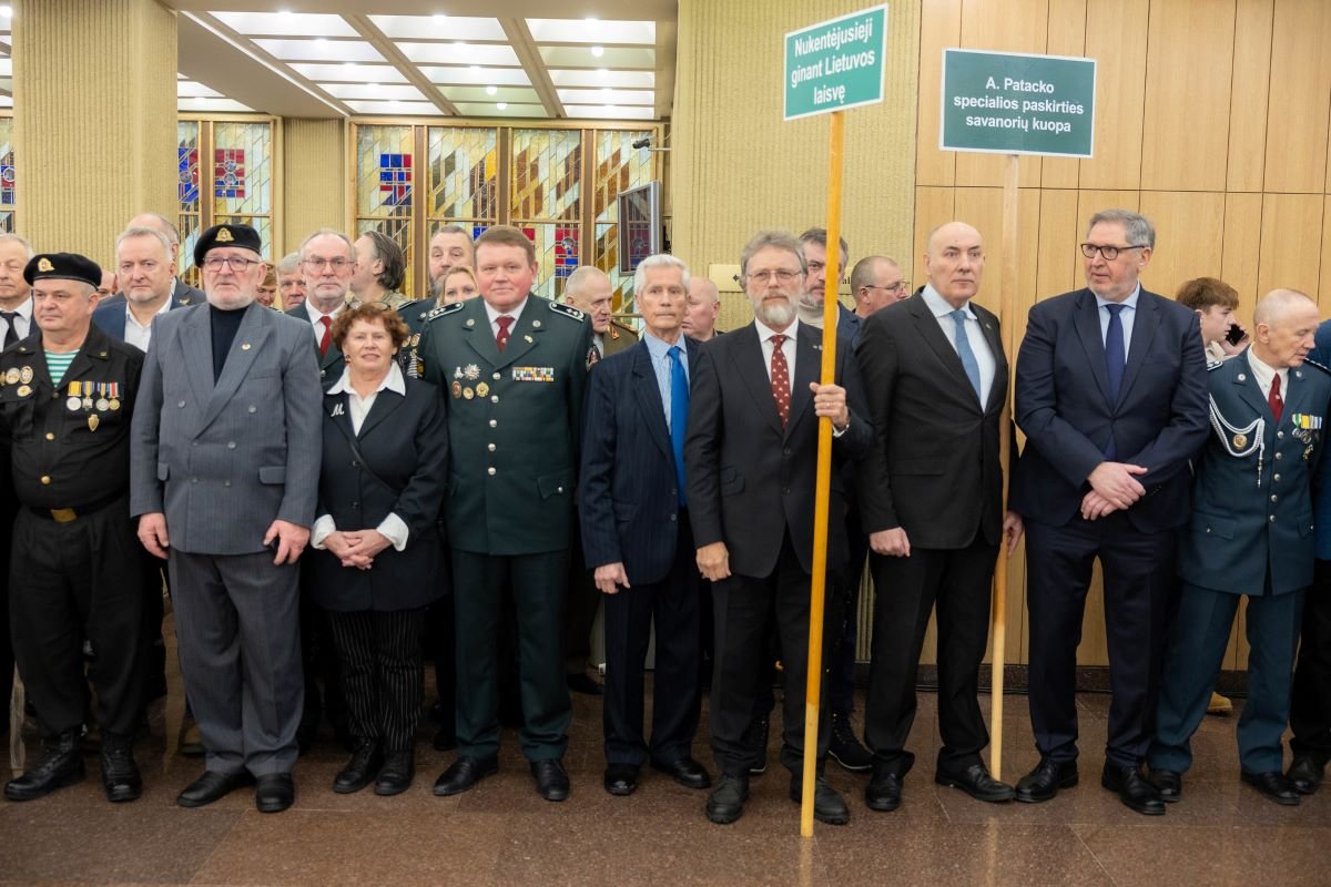 „Sveiks, tamsta!“ – pirmajam atkurtos valstybės vadovui atsakė susirinkusieji Seimo Lietuvos Laisvės gynėjų galerijoje.