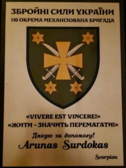 Ačiū Valstybinei mokesčių inspekcijai už Ukrainos kariams perduotus automobilius ir daugumos tų automobilių remonto, kuro ir naujų akumuliatorių išlaidas padengusiam Lietuvos kariuomenės kūrėjų savanorių sąjungos Vilniaus apskrities skyriui (LKKSS VAS), nuolat renkančiam aukas kovojančiai Ukrainai paremti. Ačiū Klaipėdos teritorinei muitinei ir Kauno teritorinei muitinei už rūbus, uniformas, kombinezonus kurie perduoti Ukrainos ginkluotųjų pajėgų 3 brigados kariams ir kitur. Ačiū Gintautui Miškiniui už pastovų paramos rinkimą, visapusišką pagalba, taip pat ir tvarkant automobilius. Ačiū Šlivinskų šeimai, Arvydui Noreikai už pastovia finansinę paramą. Ačiū Juliui Petrašiūnui už vitaminus. Ačiū Mindaugui, Rimui, Kęstui ir kitiems už paramą.